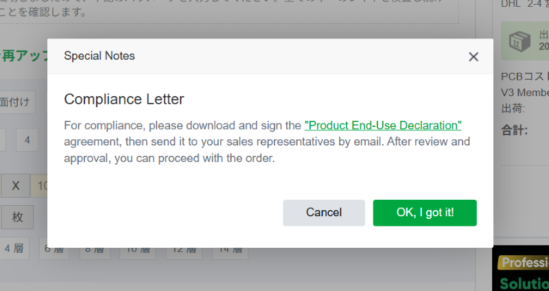 図 PCBWayさんに基板発注時に表示される特記事項1(製品最終用途申告書への署名と送付)