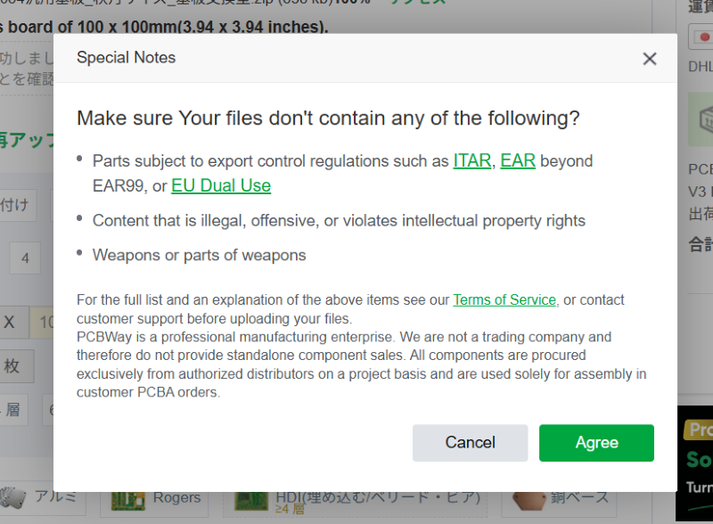 図 PCBWayさんに基板発注時に表示される特記事項2(武器、違法、輸出規制関連)