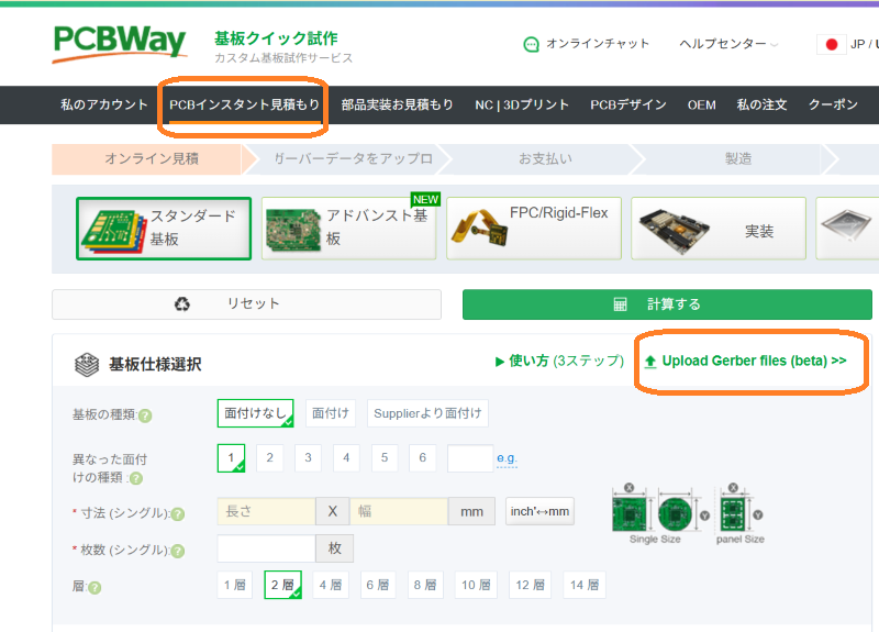 PCBWayさんのサイトで「PCBインスタント見積もり」をクリックすると下図が出る。