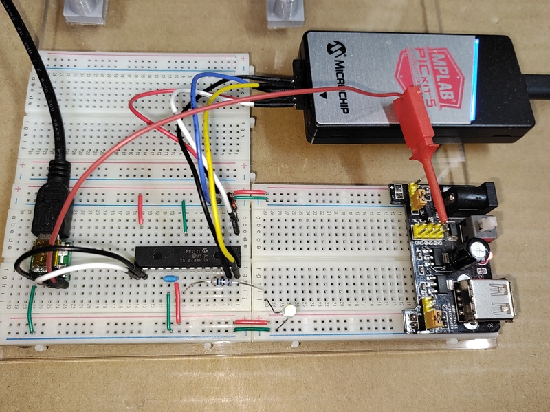 このPICは電源電圧3.3Vだが、ブレッドボード右端に取り付けた電源基板にUSBの5V電源を入れてやれば3.3Vも生成してくれる便利な電源なので、それを使っている。