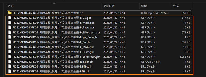 あとは、オレンジ枠のガーバーファイルを全部選択して、1つのZIPファイルにまとめれば良い。