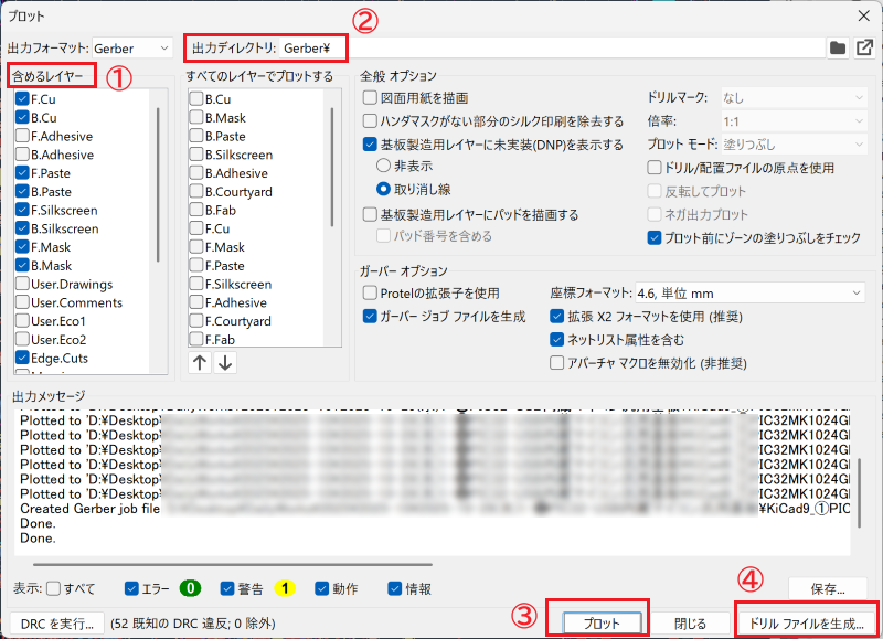 「②出力ディレクトリ」部分には今から出力予定のガーバーファイルを保管する場所を設定する。ワテの場合はGerberフォルダを作成した。
