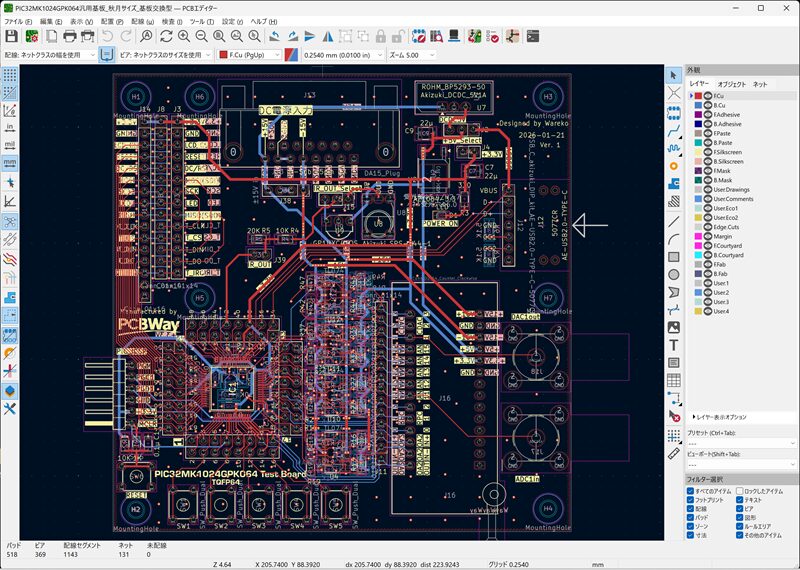 次に、32bitな高性能PICマイコンPIC32MK1024GPK064を使って実験するための汎用実験基板の設計やそのプリント基板をPCBWayさんへ発注する過程を紹介した。