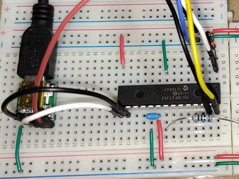 上写真左は黒いUSB Mini-Bケーブルをブレッドボード用ソケットに挿している。USBの5V電源を利用するためだ。赤ワイヤーが5V、緑がワイヤー GNDだ。白と黒のワイヤーはUSB通信用の信号線なのだが、現状ではこのPICマイコンはUSB通信用のプログラムを書き込んでいないので、USBデバイスとしてはパソコンからは認識されない。