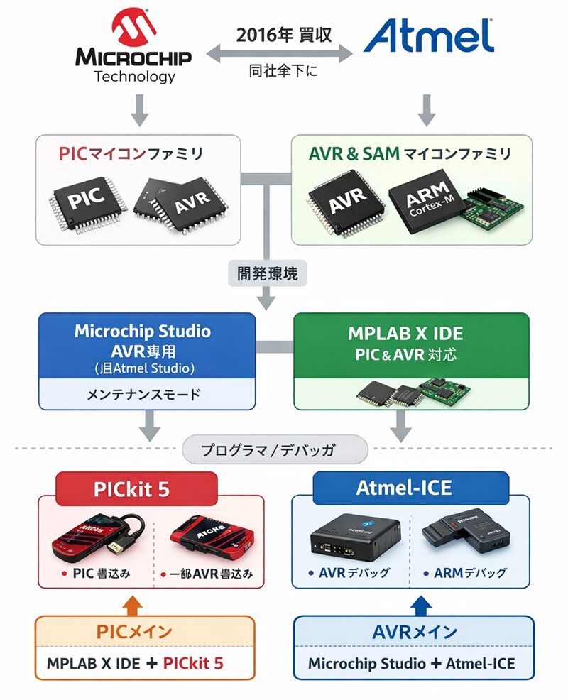 そのAtmel社は現在Microchip Technology社に買収されている。その結果、元々PICマイコンを開発・製造していたMicrochip Technology社にはAVRマイコンとPICマイコンの2つの製品群が存在する事になった。