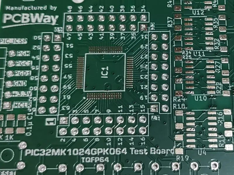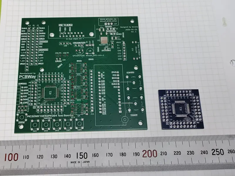 一方、下写真の小型基板はPIC32MKのTQFP64基板パターンの部分を取り出したものだ。