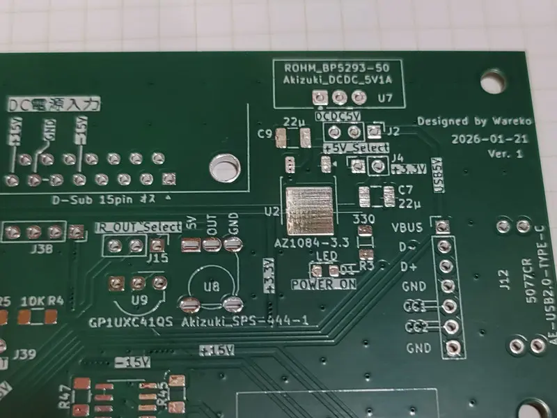 半田付けパッドの仕上げは有鉛半田メッキ指定でPCBWayさんに発注していたが、上写真のように綺麗な光沢のある有鉛半田メッキ仕上げになっていることが分かる。