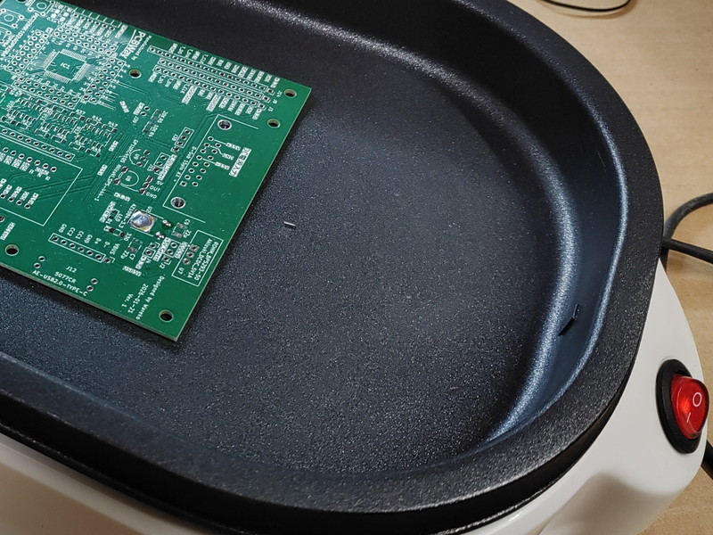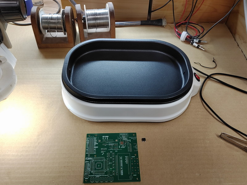 なので、家庭用のホットプレートを使って簡易リフロー方式による半田付けを行う(下写真)。