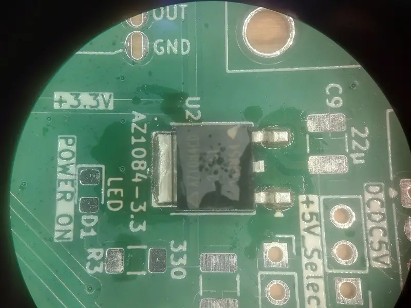 下写真は実体顕微鏡を使って、三端子レギュレータの半田付けを確認している様子を示す。