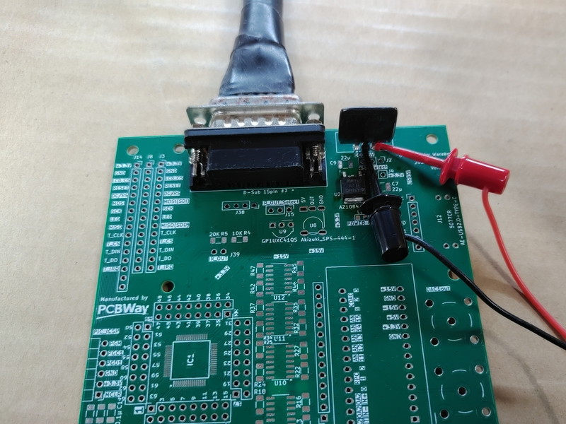 それらの作業も下写真のように完了したので、さっそくD-SUB15メスソケットで電源を供給してみた。D-SUB15ソケットに刺さっているのがワテ自作の外部電源だ。(-15V)-GND-(+15V)が供給されている。