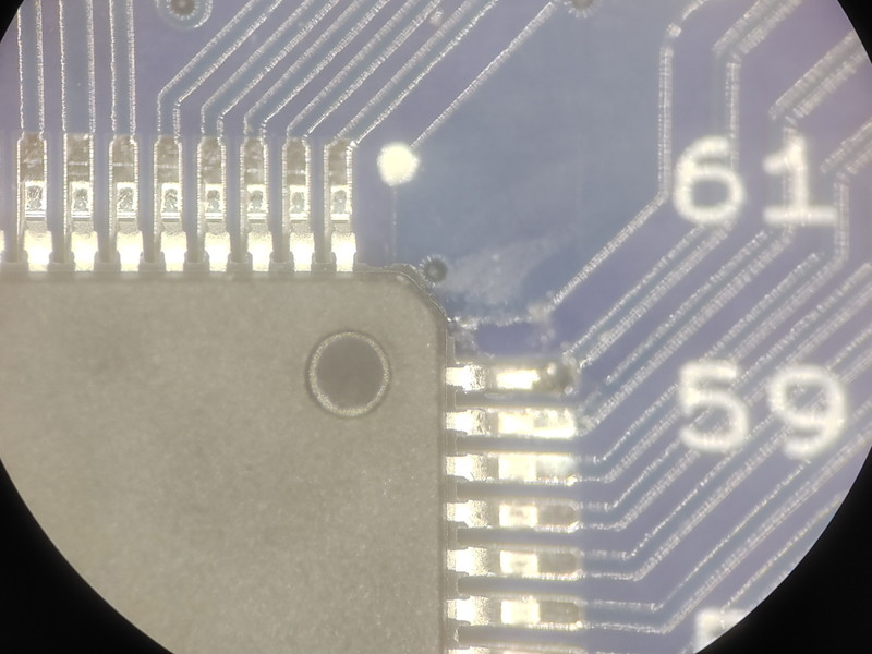 写真 汎用実験基板のPIC32MK半田付けTQFP64パッドの拡大