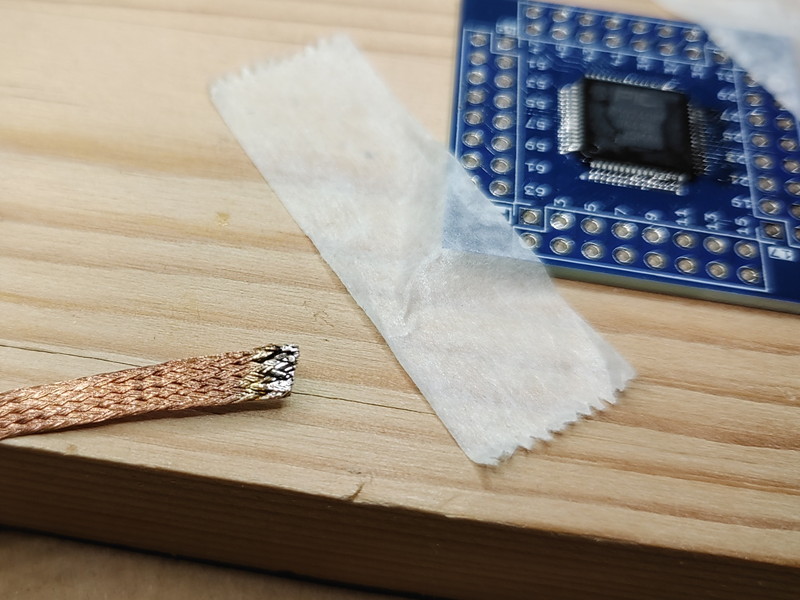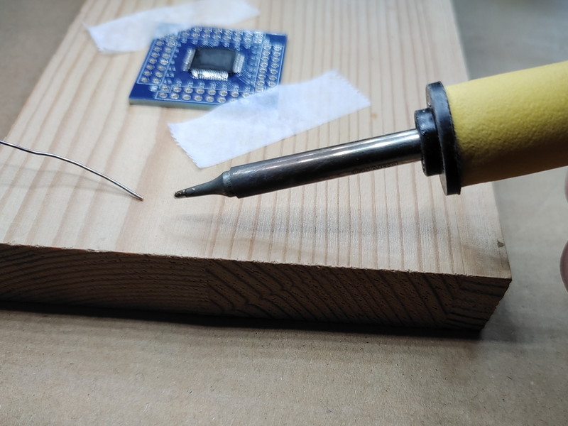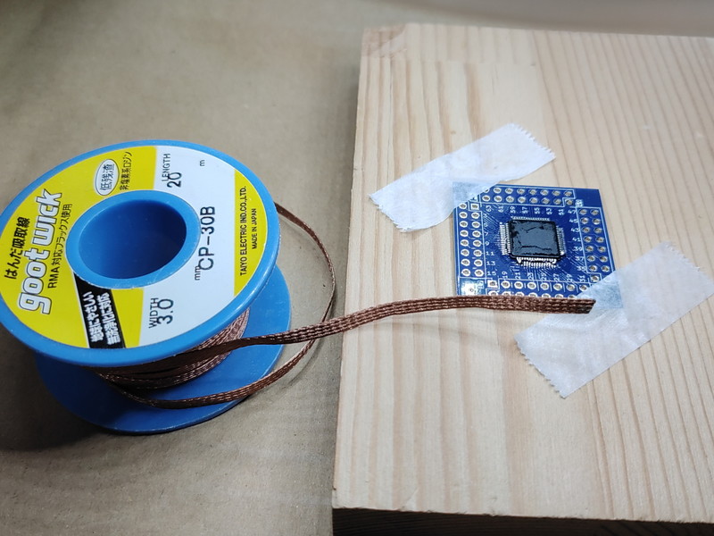 なお、このあとの作業をやりやすくするために、下写真のように軽くて動きやすい小さな基板を木製の台座にマスキングテープで固定しておく。