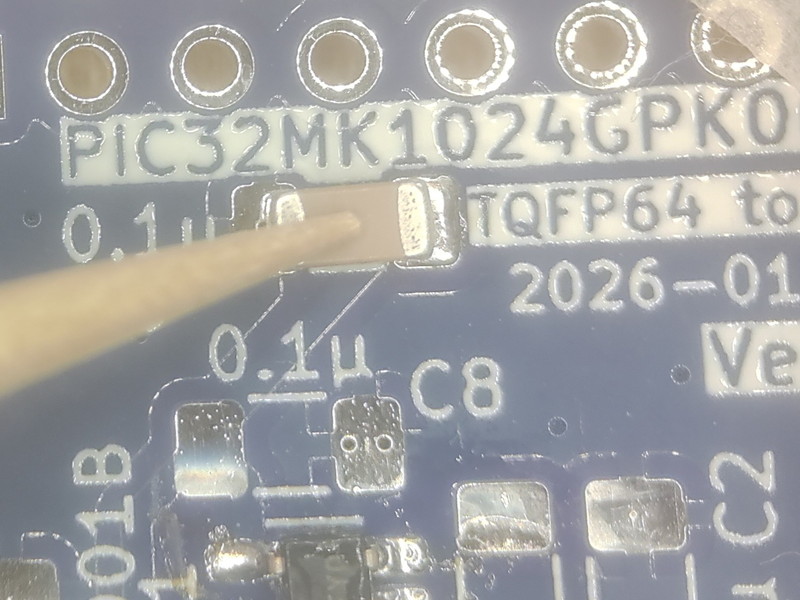ただし、上写真の場所にTQFP64ピンPIC32MK1024GPK064を半田付けすると、そのPICマイコンは他の基板で利用出来ない。
