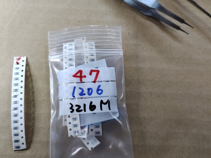 下写真は47Ωで3216M(1206)サイズの抵抗だ。ワテはナイロン袋に収納する方式でチップ部品を整理整頓している。