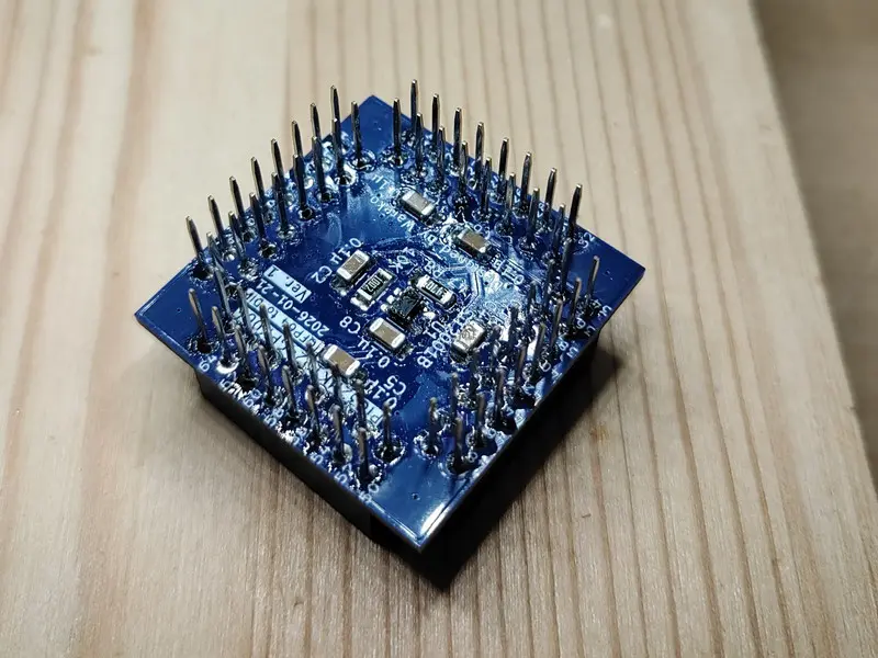 下写真のように64ピンすべての電極を半田付けした。各ピンを1つずつ素早く半田付けして行ったので、中には隣とブリッジしてしまっているピンも数カ所あるが気にしない。
