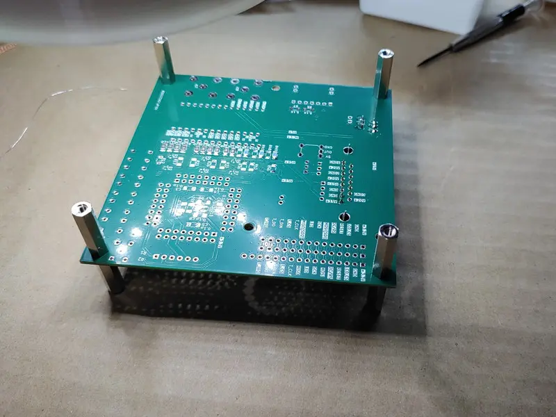 写真 作業机の上に敷いているダンボールの上で基板を冷却