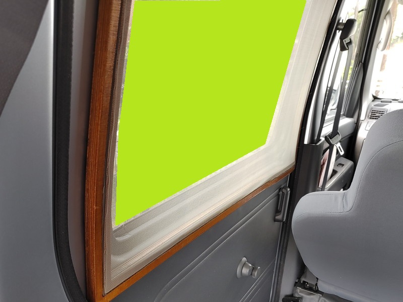 どこが素晴らしいかと言うと、写真でも分かるように網戸の木枠が軽バンスライドドアの湾曲した鉄板にピッタリと合うように、木枠自体が湾曲しているのだ。