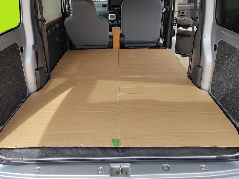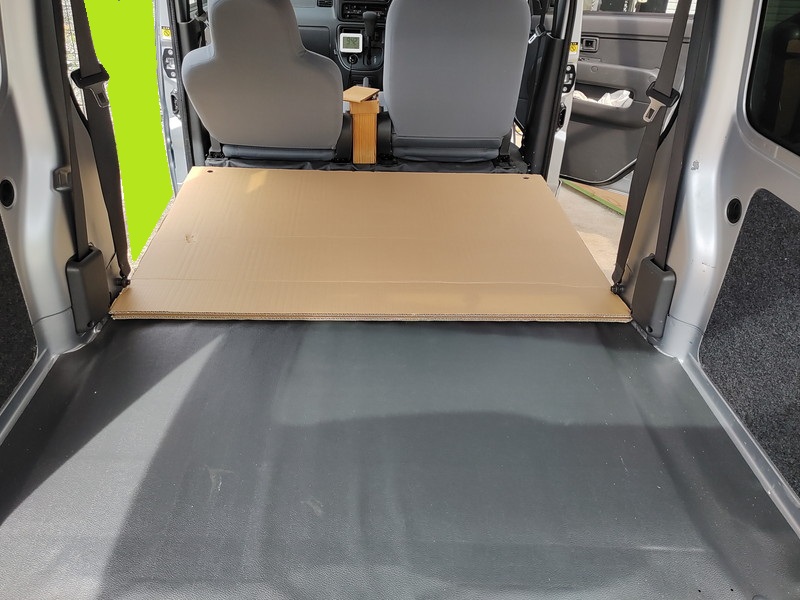 このあとの作業で荷室に合板を敷くが、この段ボールを使って荷室の形状を写し取った。