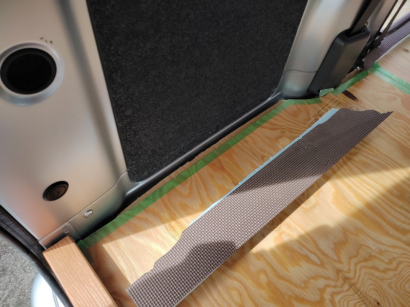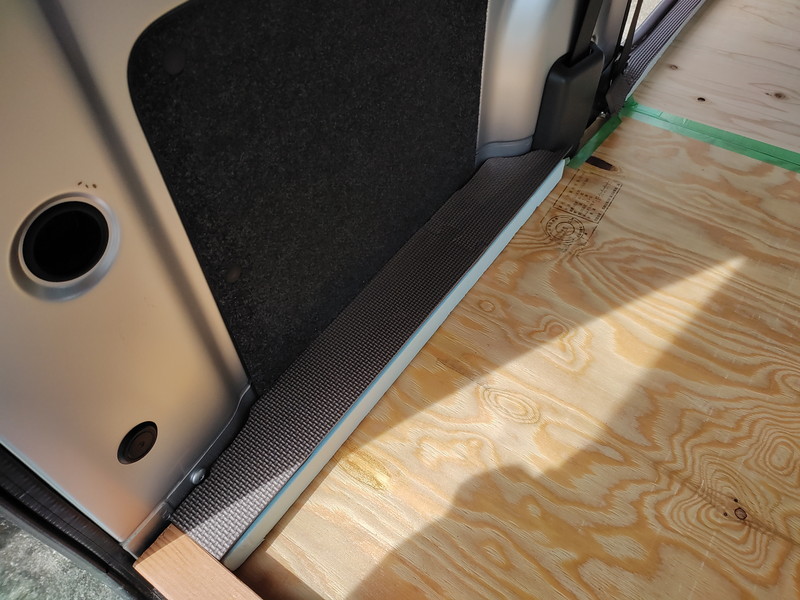 下写真のように、床に敷いた合板とボディ側面とは1~2cmくらい隙間があるほうが、合板を脱着しやすい。