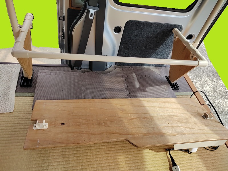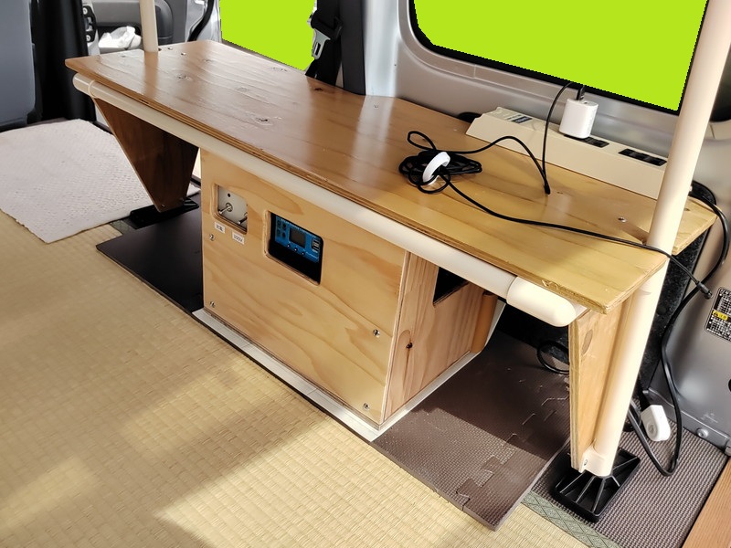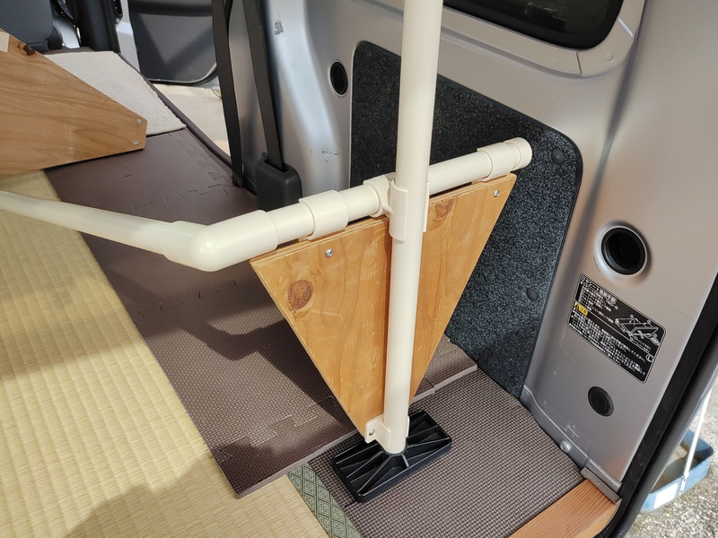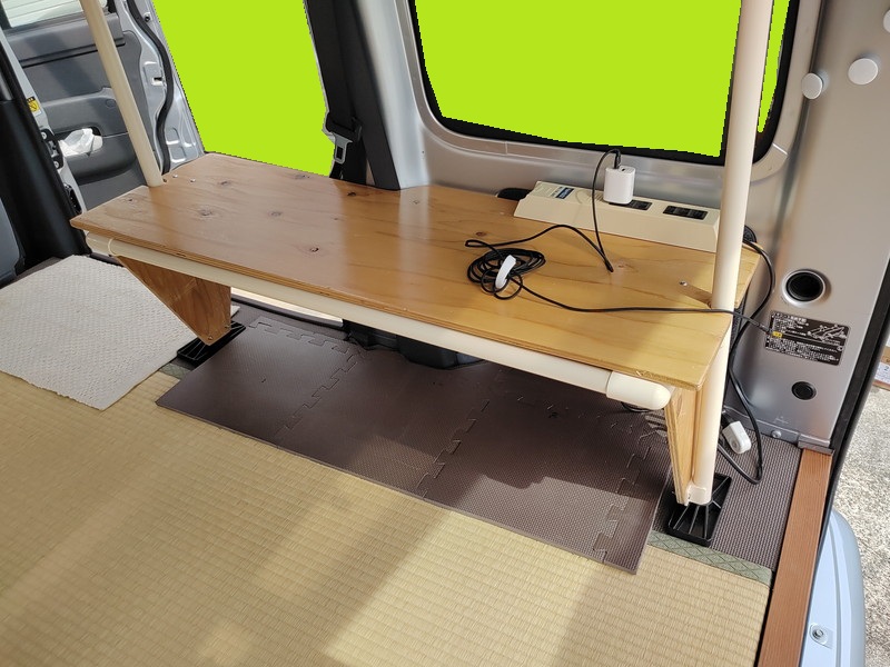 繰り返しになるが、逆三角形の側板のお陰で運転席後部スライドドア側からもサイドテーブル下部に手が入るし、後部ハッチバック側からも手が入れやすいので、我ながら良い構造だと思う。