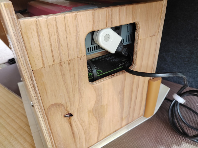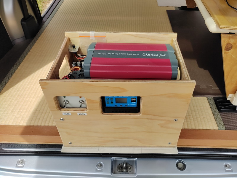 写真 針葉樹合板木枠に組み込んだ24V昇圧型サブバッテリーシステム