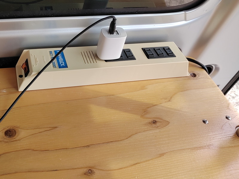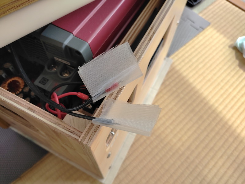 下写真のように24VインバーターのAC100V出力をサイドテーブル天板に固定したテーブルタップに配線した。
