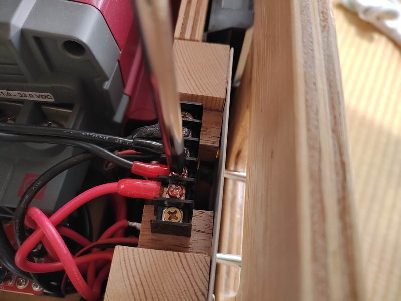 そのKTC木柄ドライバーで12V電線を端子台に接続した(下写真)。