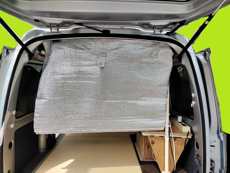 最後に、後部ハッチバックに目隠しカーテンを取り付ける。