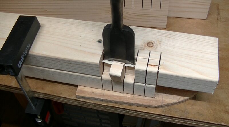 その部分を中古で買った48mm鑿で切り取って、組み木加工の凹の形状にする。