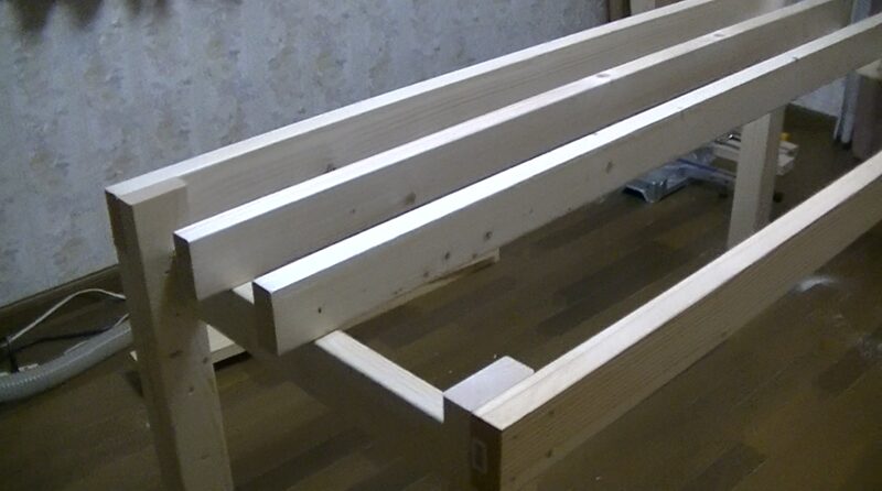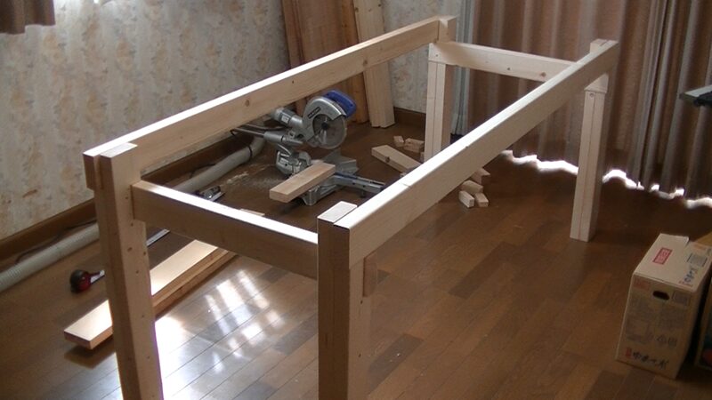 下写真のように四つの脚に二本の横棒を組み木して、その上に縦長の2×4(6フィート=1829mm)材も二本渡した。