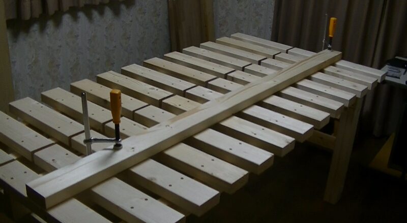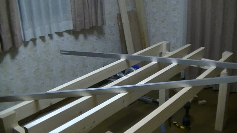F型クランプが写っているが、2分割したスノコを二本の棒で挟んで直線状にしてからコーススレッドで固定する手法で作業をしたのだ。