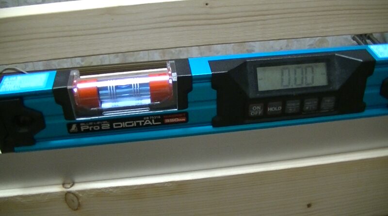 下写真のように長いアルミ角パイプを使うと水平が確認しやすい。