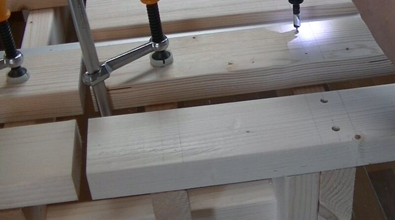 写真 コーススレッドを10mmほどスノコに埋め込む為に皿取錐で穴掘り