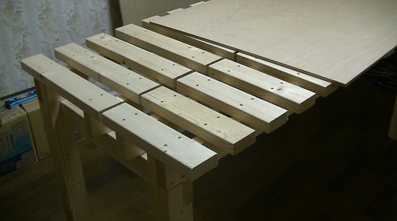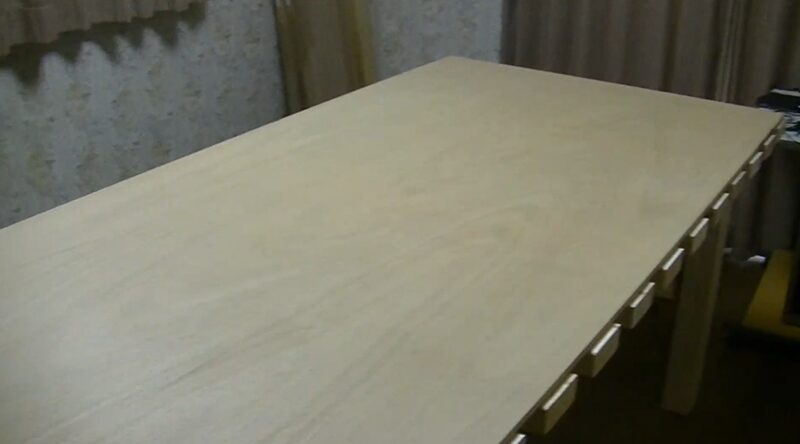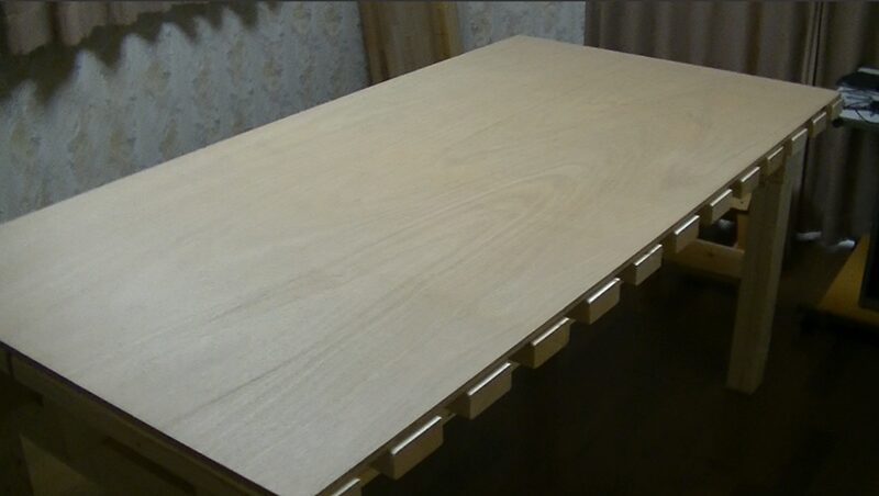 写真 完成したスノコ作業台の上に天板(サブロク板12ミリ厚ラワン合板)を載せてみた