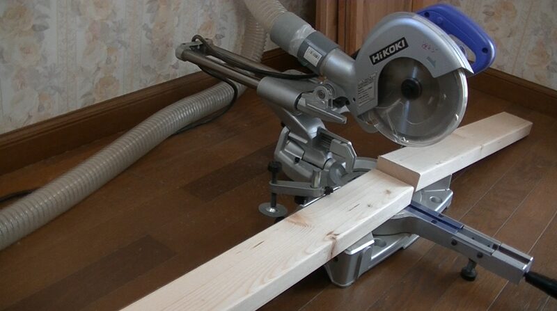 上写真のようにスライド丸鋸を使って2×4材をカットする。