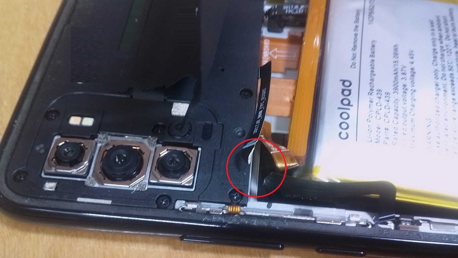 そこで指を引っ掛けて強く持ち上げたらバッテリーが剥がれたのだが、同時に周囲のフレキケーブルを引き千切ってしまった(下写真)。