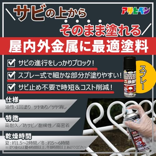 アサヒペン油性高耐久鉄部用スプレーの塗料の特徴としては以下の通り。